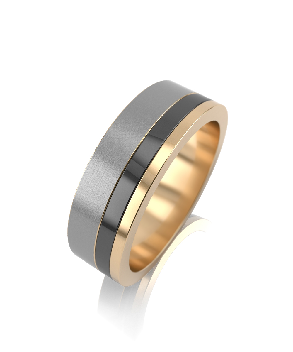 Обручальное кольцо, выполненное в сочетании белого и желтого золота 585 пробы с черной керамикой.