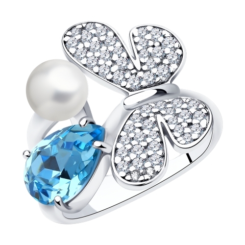 Кольцо из серебра с жемчугом синтетическим и фианитами