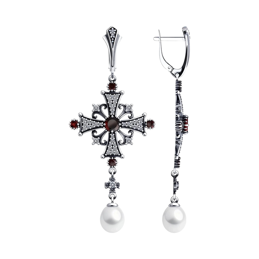 Серьги из серебра с гранатом,жемчугом и фианитами