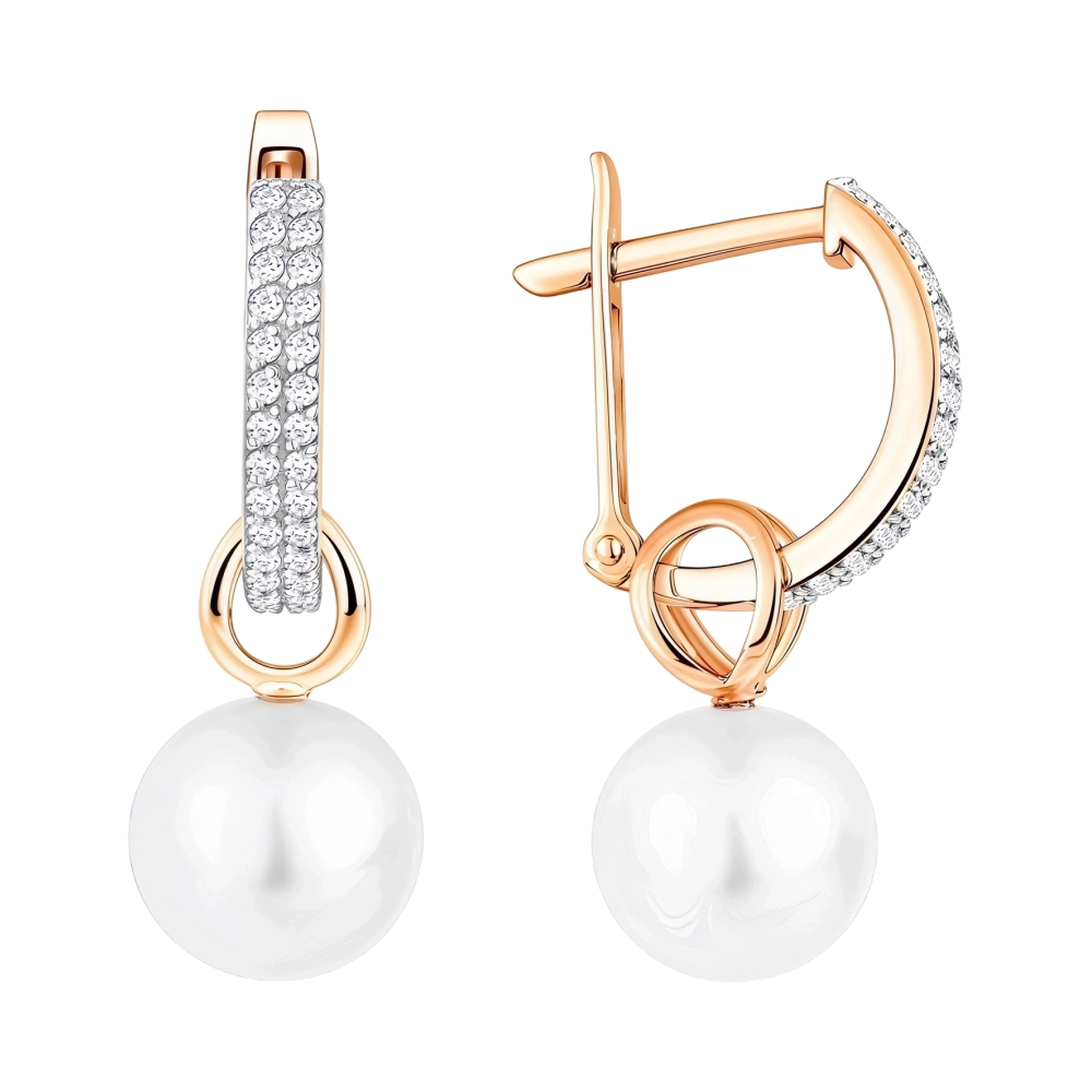 Серьги из красного золота с жемчугом и фианитами